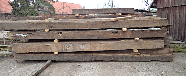 550 x 33 x 31 cm, gerade, scharfkantig und maßhaltig, jedoch mit meist ein bis zwei Zapfenlöchern (durchgezapft) in jeder Ansicht. Sie stammen aus dem Innenständerwerk einer alten Zehntscheune in Schleswig-Holstein, ca. 400 Jahre alt.