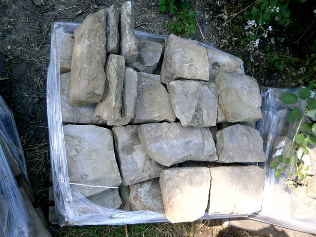 Kantensteine aus gelbem Sandstein, ehemals als Kantensteine einer Klinkerstraße hochkant verlegt, in unterschiedlichen Längen von ca. 20 bis 40 cm, Breite ca. 25 bis 30 cm, Dicke ca. 8 cm. Sie eignen sich hervorragend als Begrenzung von Pflasterungen, Beeten und Rasenflächen, flach oder hochkant verlegt zur Pflasterung von Wegen und auch als Trockenmauer oder Dekoration im Garten.