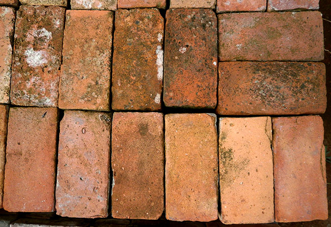 Maschinell hergestellte Rotsteine, Reichsformat, die zur Pflasterung im Innenbereich verlegt wurden, mit sehr glatter Oberfläche. Sie nehmen Wasser auf und sind daher nur für den Innenbereich oder den überdachten Außenbereich geeignet.