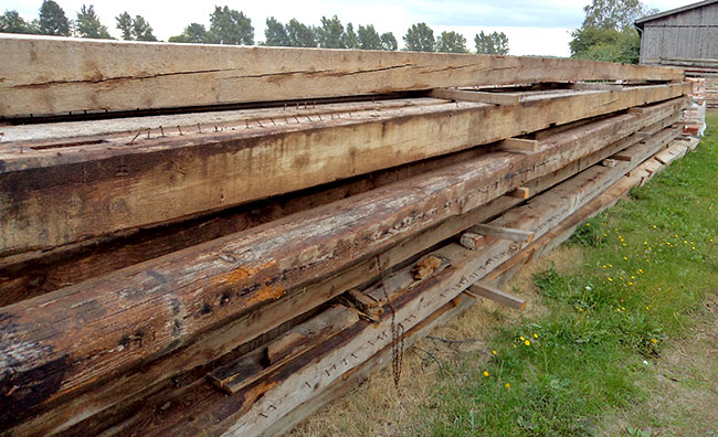 Ebenso wie Eichenbalken haben wir auch alte Weichholzbalken, meist Fichte/Tanne, aber auch Kiefer. Die Längen reichen bis 15 m und können bis zu 40 x 40 cm im Querschnitt betragen. Unsere Balken waren meist als Deckenbalken oder Dachsparren eingebaut und sind oft baumkantig, manche auch fast rund. Es gibt aber auch scharfkantige Balken. Die Balken werden grob gereinigt, von Fremdanhaftungen befreit und oberflächlich entnagelt, auf Wunsch auch maschinell gebürstet.